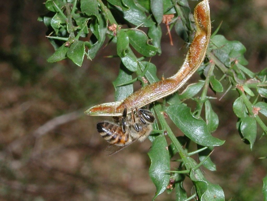 Example of a honeybee collecting plant resin to produce propolis from the seed pod of kangaroo thorn (Acacia paradoxa).